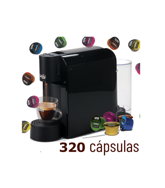 Escoge entre nuestros dos modelos de cafetera, blanca o negra y elige 320 cápsulas de entre nuestras 5 variedades.